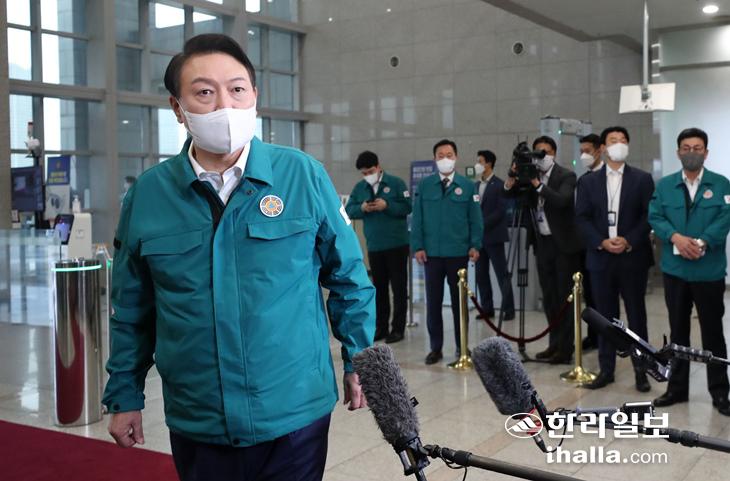 윤석열 대통령이 5일 오전 서울 용산 대통령실 청사로 출근하며 북상하는 태풍 힌남노 관련 선조치 후보고를 강조하고 있다. 연합뉴스