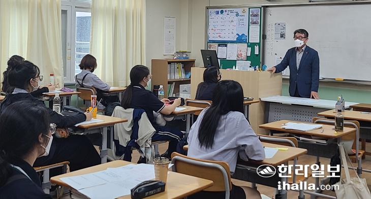 지난 2일 애월고등학교에서 제주도교육청의 4·3평화·인권교육 명예교사가 참여하는 '찾아가는 4·3교육'이 진행되고 있다. 사진=제주도교육청