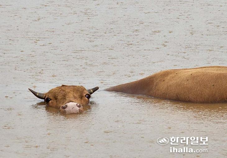 지난 4일 낮 서귀포시 대정은 동일리에서 소 한 마리가 저류지에 갇혔다는 신고 접수됐다. 이날 시간당 74.5㎜의 기록적인 폭우가 내리면서 줄에 묶여 있던 소가 불어난 물에 이러지도 저러지도 못하고 갇혀버린 것이다. 독자제공
