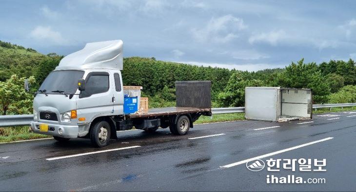 5일 오전 서귀포시 대정읍 평화로에서 강풍에 트럭 적재함이 날아가는 피해가 발생했다. 독자 제공
