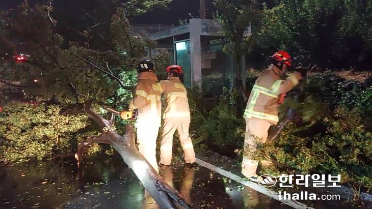 같은날 오후 7시30분쯤 서귀포시 강정동의 한 도로에서는 가로수가 강풍에 전도됐다는 신고가 접수됐다. 소방당국은 가로수가 버스정류장 앞을 가로 막은 점을 감안해 전기톱을 이용해 가로수를 절단, 철거했다. 서귀포소방서