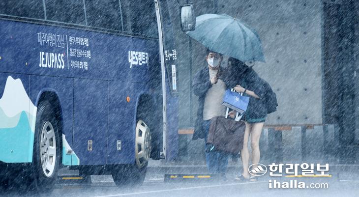 5일 제주국제공항에 비바람이 들이치는 가운데, 관광객들이 우산을 쓰고 발걸음을 재촉하고있다. 이상국기자