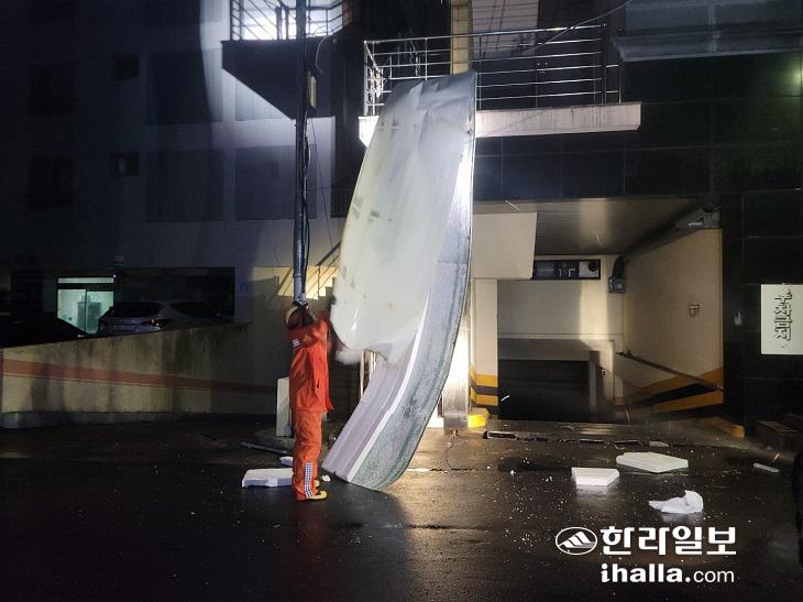 6일 새벽 제주시청 인근에서 샌드위치 판넬이 강풍에 날려 전깃줄에 걸리는 사고가 발생했다. 제주소방서