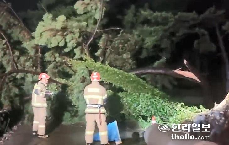 6일 새벽 제주시 한림읍에서 나무가 강풍에 꺾어져 소방대원들이 안전 조치를 하고 있다. 서부소방서