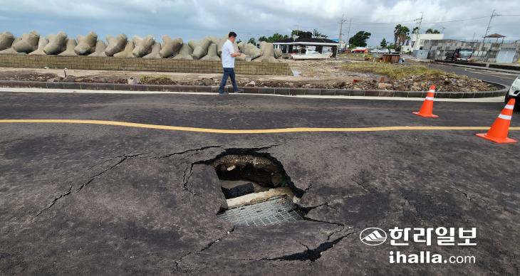 6일 오전 제주 강정항 도로가 태풍 힌남노에 부서져 있다. 연합뉴스
