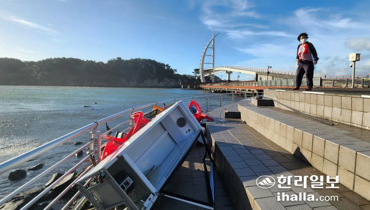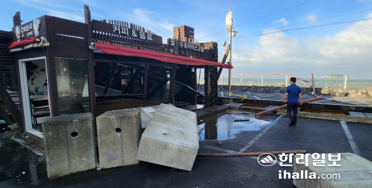 6일 오전 서귀포항 새연교 주차장 매점이 태풍 힌남노에 부서져 있다. 연합뉴스