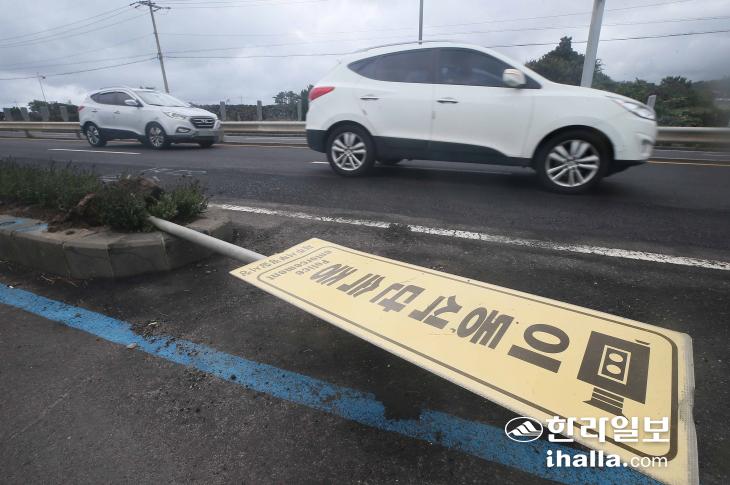 제11호 태풍 '힌남노'가 제주를 할퀴고 지나간 6일 제주시 애월읍 곽지리 도로에 '이동식 단속중'을 알리는 도로 표지판이 쓰러져 있다. 연합뉴스