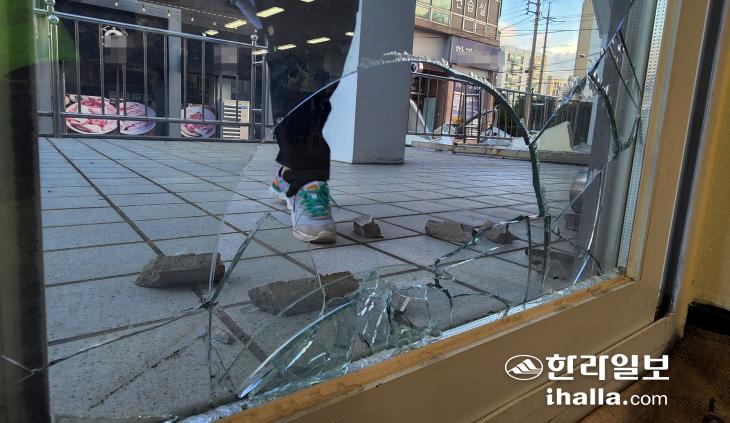 태풍 힌남노에 날라온 가건물로 깨진 제주도 남원읍사무소 창문. 가건물은 읍사무소 옆 빌딩 옥상 시설로 사무소 계단과 1층 창문 등을 파손했다. 연합뉴스