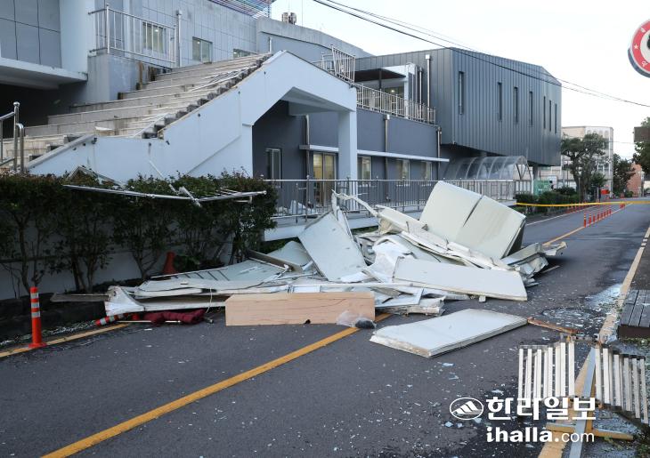 6일 오전 제주도 남원읍사무소에 태풍 힌남노에 날라온 가건물이 떨어져 있다. 읍사무소 옆 빌딩 옥상 가건물로 사무소 계단과 1층 창문 등을 파손했다. 연합뉴스