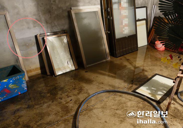 지난 5일 오후 9시56분쯤 제주시 삼양동의 한 건물 지하로 빗물이 들이치며 침수 피해가 발생했다. 6일 오전 침수 현장에는 대부분의 빗물이 배수됐지만 벽면에는 빗물이 차올랐던 흔적이 선명히 남아있다. 김도영기자