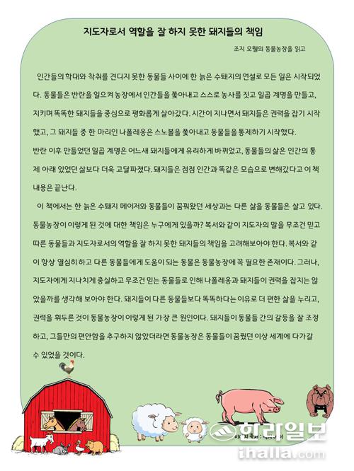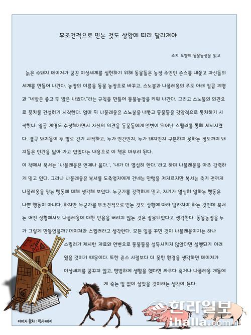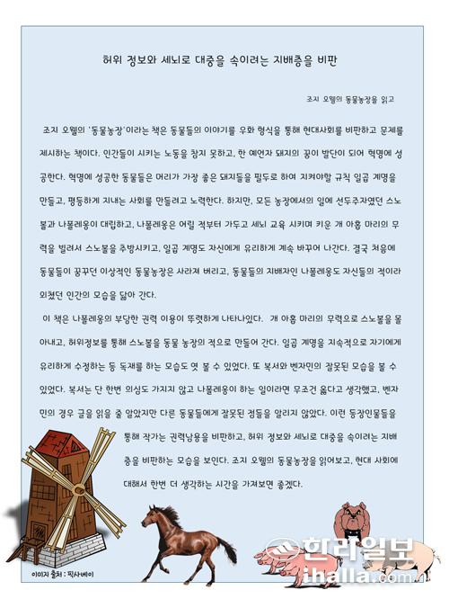 ▶수업 성취기준 : 1. '동물농장'(조지 오웰 지음, 민음사 펴냄)을 읽고, 우리가 살아가는 시대에 적용해 비판할 수 있다.
