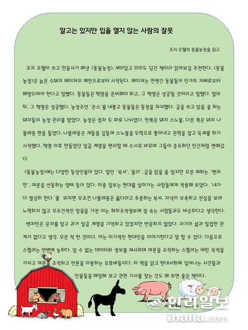 우화란 사람처럼 행동하고 말하는 동물들을 주인공으로 삼으며 인간의 어리석음과 약점을 부각하기 위해 지어낸 이야기이다. 이 시대를 살아가고 있는 청소년에게 이 고전 문학을 읽게 하면서 굳이 러시아 혁명이 무엇이며 마르크스와 스탈린이 누구고 하는 이야기는 언급할 필요는 없었다. 우화는 지금 현실 상황에 적용해 사회적 풍자를 언급할 수 있는 서사 형식을 가진 매력적인 장르이기 때문이다. 민주주의 주제 수업에 '동물농장'(조지 오웰 지음, 민음사 펴냄)을 선택한 이유다.