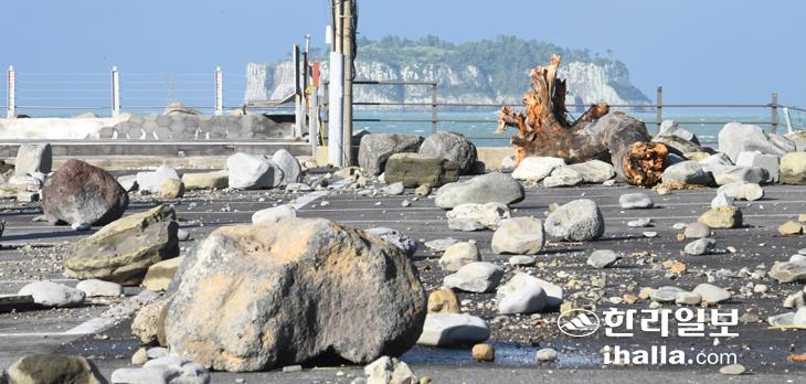 6일 서귀포시 새연교 주차장에 제11호 태풍 '힌남노'의 영향으로 떠밀려온 바위들이 널브러져 있다. 이상국기자