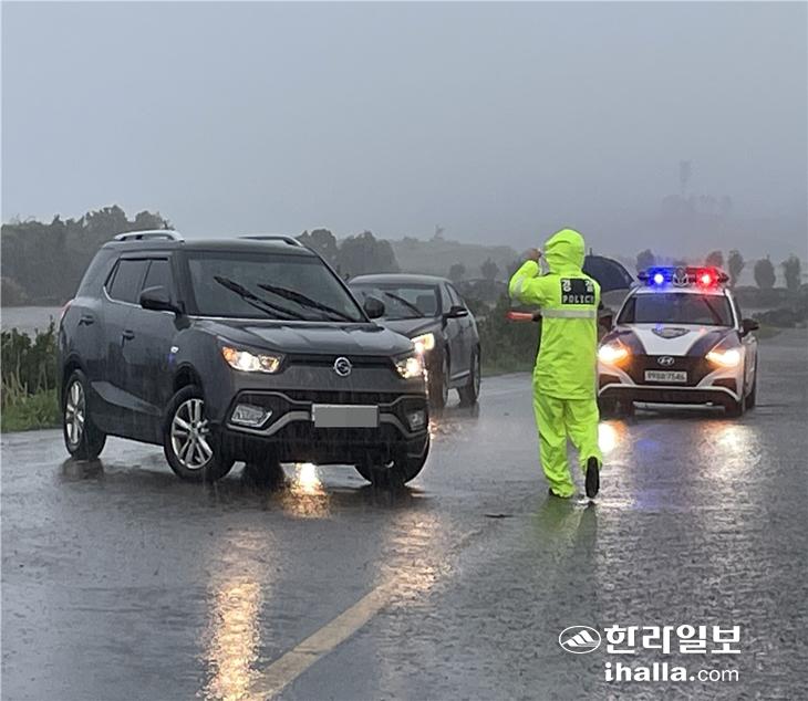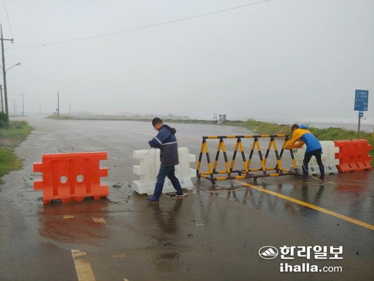 서귀포시 대정은 소재 해안도로가 침수돼 경찰이 통제 작업을 벌이고 있다. 독자 제공