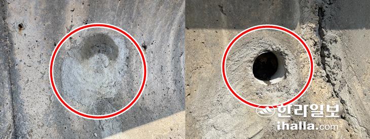7일 현장 확인 결과 빗물이 빠지는 배수구가 콘크리트로 막혀 있거나(왼쪽), 콘크리트가 발라진 돌이 박혀 있었다. 송은범기자