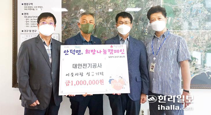 대안전기공사(대표 진승용)는 지난 8일 안덕면을 방문, 지역 내 어려운 이웃에게 사용해달라며 성금 100만원을 기탁했다.