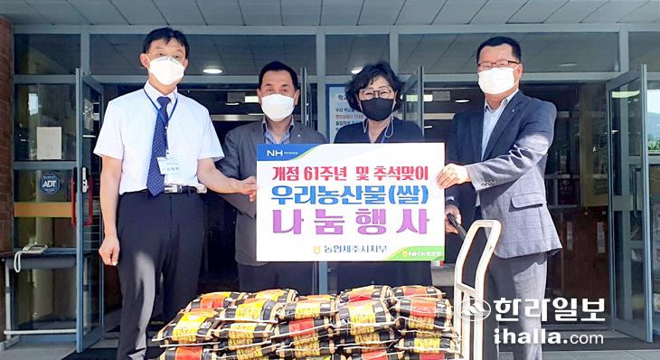 NH농협 제주시지부(지부장 고우일)는 개점 61주년을 기념하고 추석 명절을 맞아 지난 7일 신제주초등학교(교장 김혜자)에서 사랑의 쌀 200㎏ 나눔 행사를 실시했다.