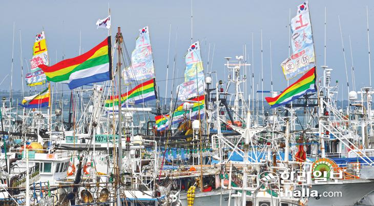 추석 연휴인 11일 서귀포시 성산항에 정박중인 어선마다 선원들의 무사안녕과 풍어를 기원하는 만선기가 펄럭이고 있다. 강희만기자