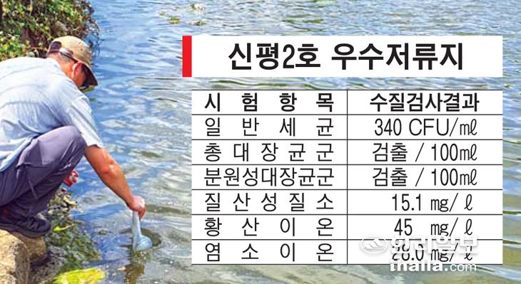 이 숨골 유입 지표수의 발원지인 신평2호 우수저류지 수질은 더욱 심각했다. 일반세균 340CFU/㎖ ▷총대장균군 검출/ 100㎖▷분원성대장균군 검출/ 100㎖ ▷질산성 질소 15.1㎎/L ▷황산이온 45㎎/L ▷염소이온 28.0㎎/L를 보였다. 분뇨와 비료 등에서 기인하고 있는 염소이온과 황산이온이 기준치를 초과 한 것이다. 강우시 주변 농지 등에서 나온 오염 지표수들이 이곳으로 유입되고 있기 때문으로 분석됐다.