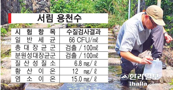 서림수원지 용천수에서는 ▷일반세균 66CFU/㎖ ▷총대장균군 검출/ 100㎖ ▷분원성대장균군 검출/ 100㎖ ▷질산성 질소 6.8㎎/L ▷황산이온 12㎎/L ▷염소이온 15.0㎎/L 등이 검출됐다.