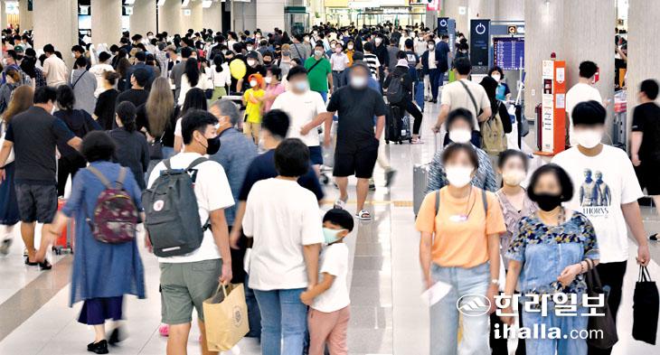 추석 연휴 마지막 날인 12일 제주국제공항 출발 대합실에는 추석을 고향에서 보내고 일상으로 돌아가려는 귀경객과 관광객들로 붐비고 있다. 강희만기자