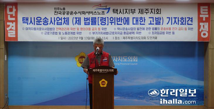 민주노총 공공운수노조 택시지부 제주지회 이승명 지회장이 13일 제주도의회 도민카페에서 기자회견을 열고 있다. 김도영기자
