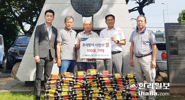 NH농협은행 JDC첨단지점(지점장 박준우)은 지난 8일 영평가시나물마을노인회(회장 강창석)를 방문해 어려운 이웃들을 위해 사용해 달라며 쌀 100포(2㎏)를 전달했다.