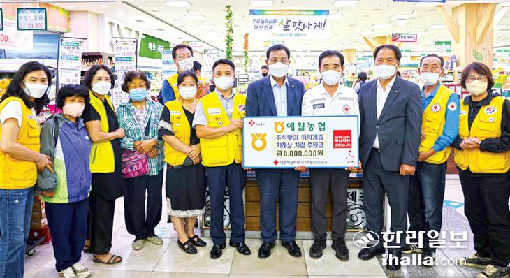 애월농협(조합장 김병수)은 지난 8일 애월농협 하나로마트에서 대한적십자사제주지사(회장 오홍식)에 추석맞이 취약계층 차례상 장보기 후원금 500만원을 전달했다. 이날 전달된 후원금은 소외된 이웃들이 행복한 추석을 보낼 수 있도록 마련됐다.