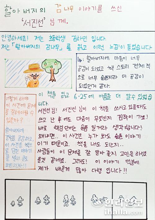 '할아버지의 감나무'(서진선 지음, 평화를품은책 펴냄)는 어린이를 위한 그림책이다. 작가의 가족을 소재로 삼은 자전적 이야기로 전쟁으로 인한 아픔과 고통이 현실에서 어떻게 나타나는지를 잘 보여주는 책이다. 전쟁에 군인으로 참가한 할아버지는 자신으로 인해 희생당한 사람들을 위해 평생 감나무를 애지중지 키우고 이름표를 걸어 기념하면서 사죄하는 모습을 아름답게 보여주는 작품이다.