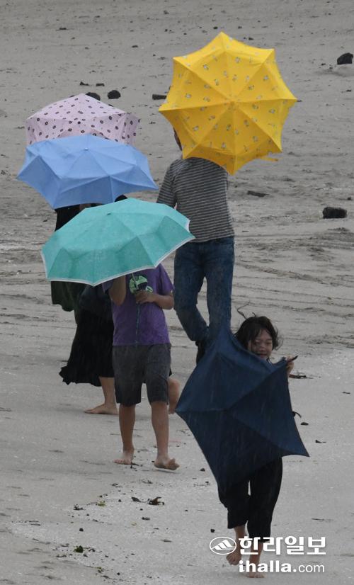 제12호 태풍 '무이파'의 영향으로 많은 비가 내린 13일 제주시 한림읍 협재해수욕장을 찾은 관광객들이 우산을 쓰고 힘겹게 걸어가고 있다. 강희만기자