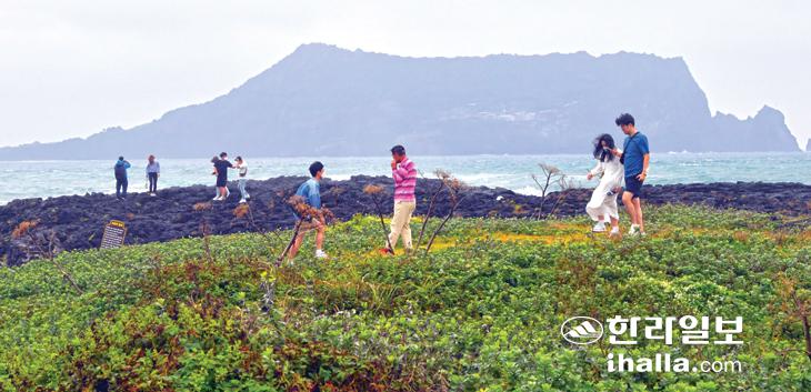 서귀포시 성산읍 아쿠아플라넷제주 산책로에서 관광객들이 일출봉을 곁에 둔채 파도가 치는 제주바다 비경을 감상하고 있다. 이상국기자