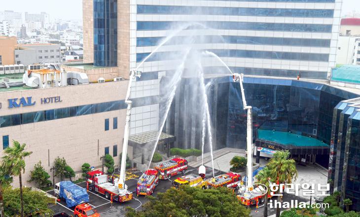 제주소방서가 효과적인 고층 건축물 화재 진압훈련을 위해 14일 제주시 소재 옛 제주칼호텔에서 훈련을 실시했다. 이번 훈련은 16일까지 진행되며 제주소방서 긴급구조 통제단과 9개 119센터, 구조대원 등 총 327명이 참여한다. 한편 제주소방서 관내에는 소방시설법에 따라 고층 건축물로 분류되는 11층 이상의 건축물이 총 252개소가 있다. 이중 복합건축물이 102개소로 가장 많고 숙박시설 54개소, 아파트 54개소, 연구시설 41개소 등의 순으로 집계됐다. 강희만기자