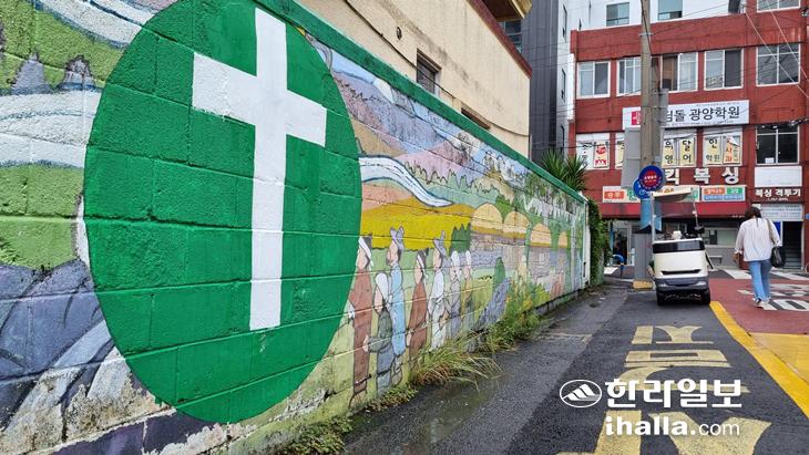 15일 광양초등학교 앞에 그려진 설문대할망 벽화가 십자가로 덧칠돼 있다.