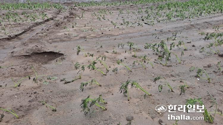 제11호 태풍 '힌남노'가 제주를 빠져나간 직후인 지난 6일 오전 제주시 구좌읍 일대 당근밭 상황. 강풍을 타고 당근밭을 덮친 바닷바람으로 당근의 어린 잎이 거무스름하게 변하고 있다.