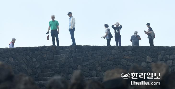 15일 제주시 구좌읍 별방진을 찾은 관광객들이 기념사진을 촬영하며 추억을 새기고 있다. 이상국기자