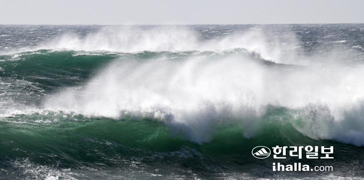 제14호 태풍 '난마돌'의 영향으로 18일 서귀포시 보목동 해안으로 높은 파도가 밀려오고 있다. 강희만기자