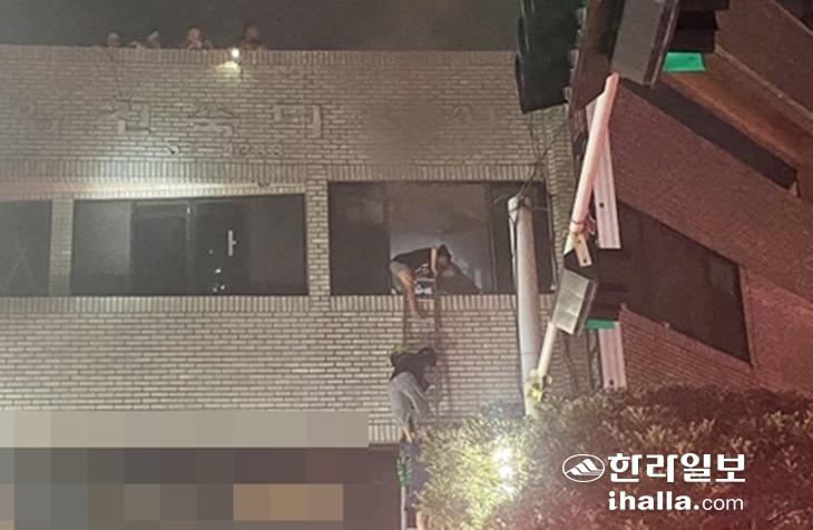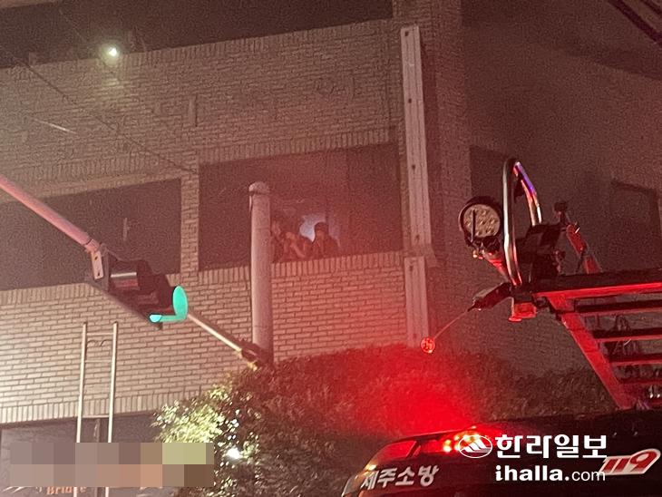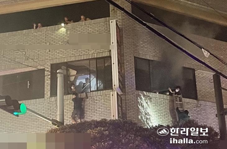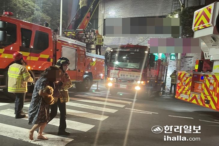 18일 오후 7시48분쯤 제주시 용담1동의 한 건물 지하 1층 유흥주점에서 화재가 발생해 16명이 중경상을 입었다. 송은범기자
