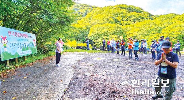 이와 관련 (사)한라산둘레길은 지난 16일 한국건강관리협회 후원으로 지역주민들이 참여하는 '국민건강 치유트레킹' 첫 행사를 개최하는 등 3회에 걸쳐 진행할 계획이다. 이날 국민건강 치유트레킹 행사에는 건강관리협회 임직원 및 지역주민 등 50여명이 참가한 가운데 한라산둘레길 천아숲길에서 숲 체험과 요가 등 다양하게 진행됐다. 김도영기자 doyoung@ihalla.com