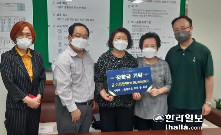 전덕자씨 등 유족들이 지난 16일 제주중앙여중을 찾아 장학금을 전달하고 있다. 사진=제주중앙여중 제공