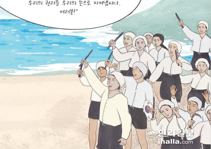 제주도교육청이 발간한 '제주 3대 항일운동 이야기' 에 실린 제주 해녀 항일운동의 한 대목. 현직 초등교사가 삽화위원으로 참여해 그림을 그렸다.
