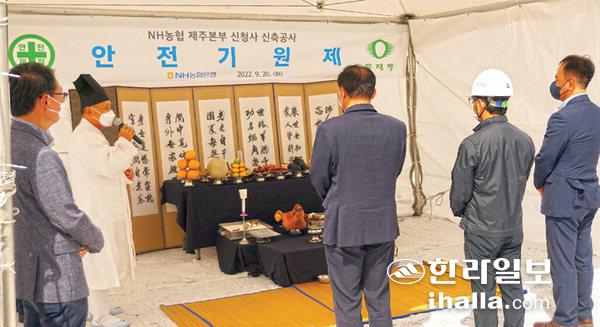 NH농협은행 제주본부(본부장 문상철)는 20일 제주시 삼도1동 현 청사 주차장 부지에서 신청사 착공에 들어가며 무사고·무재해 안전시공을 다짐하는 안전기원제를 열었다. NH농협은행은 원도심 활성화와 도시재생 정책사업 협력 차원에서 2018년 현재 청사와 맞붙은 부지를 매입해 주차장으로 사용해오다, 총사업비 273억원을 투입해 2024년 1월까지 연면적 8756㎡, 지하 2층·지상 7층 규모의 신청사를 완공할 계획이다.