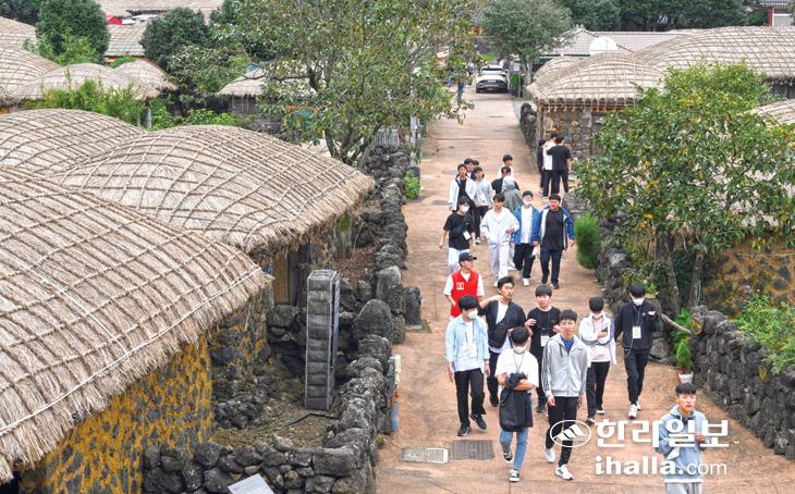 20일 서귀포시 표선면 성읍민속마을을 찾은 수학여행단 학생들이 마을 곳곳을 탐방하고 있다. 강희만기자