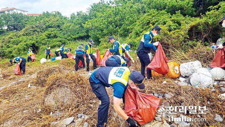 제주해안경비단(단장 총경 오인구) 2경비대는 21일 서귀포시 표선면사무소와 합동으로 태풍 복구 활동을 실시했다. 제주해안경비단 2경비대는 표선면 해안가 일대에서 쓰레기를 치우며 해안 정화에 구슬땀을 흘렸다.