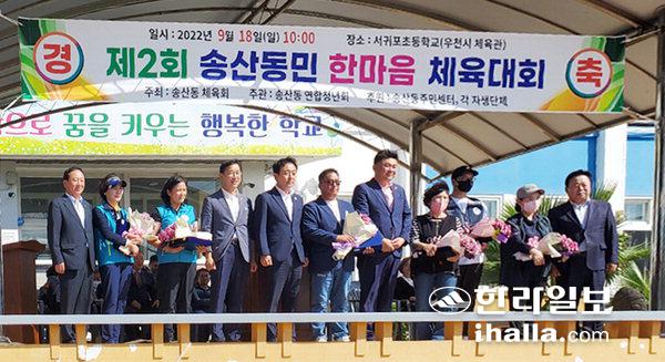 송산동체육회(회장 고문옥)는 지난 18일 서귀포초등학교 운동장에서 주민 500여명이 참여한 가운데 제2회 송산동민 한마음 체육대회를 성황리에 마쳤다.