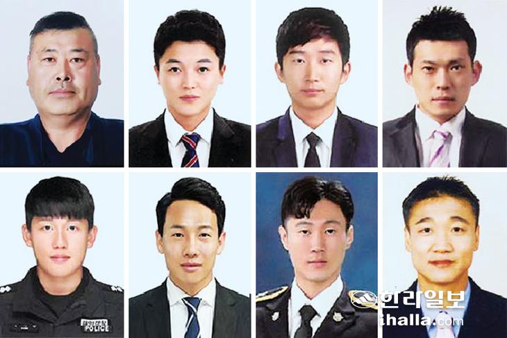 왼쪽 위부터 시계방향으로 선장 박융갑, 해양경찰 고승훈, 김명은, 김태건, 박기현, 이영길, 정호준, 황승용. 제주지방해양경찰청 제공