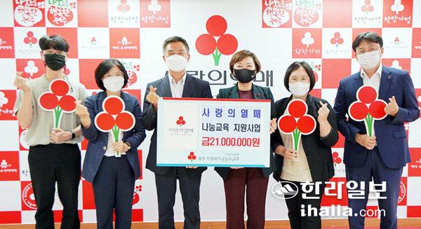 제주사회복지공동모금회(회장 강지언)는 지난 21일 모금회 회의실에서 나눔교육 활성화 협력 역할을 수행하는 아라종합사회복지관(관장 조성태)에 '2022년 나눔교육 활성화 지원' 사업비 2100만원을 전달했다.
