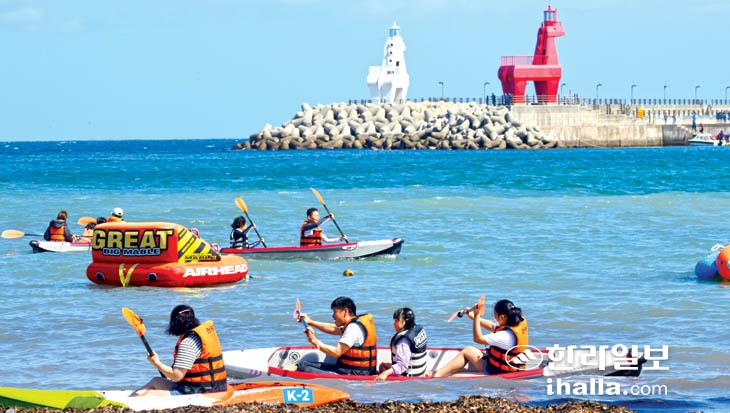 22일 제주시 이호해수욕장을 찾은 관광객들이 카약을 타며 가을 제주바다를 즐기고 있다. 이상국기자