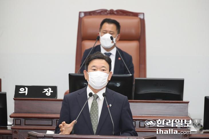 제주도의회 교육행정에 관한 질문 첫날인 23일 오전 김광수 교육감이 답변하고 있다. 사진=제주도의회