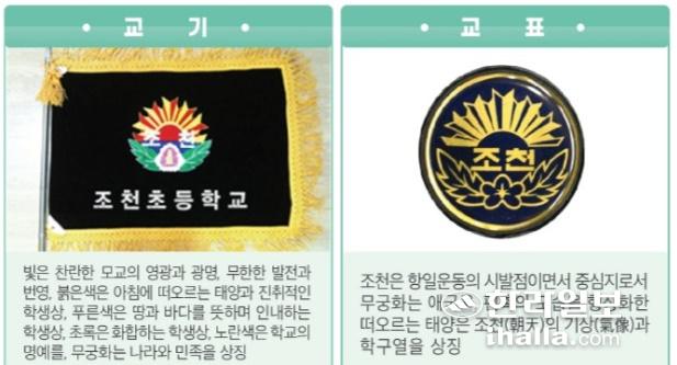 조천초등학교 교기(왼쪽)와 교표(오른쪽). 사진=조천초 홈페이지