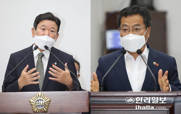 23일 교육행정 질문에서 가칭 '서부중학교' 설립 추진 상황 등을 놓고 설전을 벌인 김광수 교육감(왼쪽)과 송창권 의원(오른쪽). 사진=제주도의회